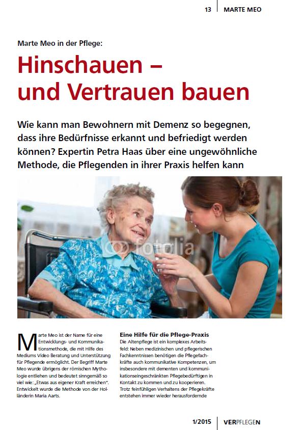Praxisfeld:AltenpflegeMarte Meo mit alten und dementiell erkrankten Menschen “Ein paar gute Momente am Tag bedeuten ein besseres Leben”Dementiell erkrankte Menschen verlieren Kompetenzen und Fertigkeiten in gleichem Maße, wie Kinder diese entwickeln. Soll bei Kindern eine Entwicklung unterstützt werden, so hilft Marte Meo bei dementen Personen, die noch vorhandenen Ressourcen zu nutzen und zu aktivieren. Heutzutage stehen Pflegekräfte unter einem enormen Arbeitsdruck: viel Arbeit – wenig Personal. Das verursacht für alle Beteiligten einen großen Stress – auch für die alten Menschen. Burn-out, innere Kündigung oder das enttäuschte Wechseln in ein anderes Berufsfeld sind die Folge. Marte Meo bezieht sich ganz konkret auf den Pflegealltag und unterstützt die Pflegenden beispielsweise bei folgenden Fragestellungen:–Wie kann ich die pflegebedürftige Person unterstützen, damit sie besser kooperieren kann?–Wie kann ich die Bedürfnisse der pflegebedürftigen Person besser erkennen?–Wie kann ich gute Momente mit den betreuten Menschen „bauen“?–Wie kann ich einer dementen Person Orientierung und Sicherheit geben?–Wie schaffe ich es, dass die pflegebedürftige Person nicht mehr so widerständig und aggressiv ist?–Wie kann ich unterstützen, dass die pflegebedürftige Person Zugang zu Ressourcen findet?–Was kann ich tun, damit ich mich nach der Arbeit nicht völlig ausgepowert fühle?Fachartikel von Petra Haas zur Anwendung von Marte Meo in der Altenpflegeerschienen in der Zeitschrift “VERPFLEGEN” im Behr´s Verlag (Hamburg), Ausgabe 1/2015: